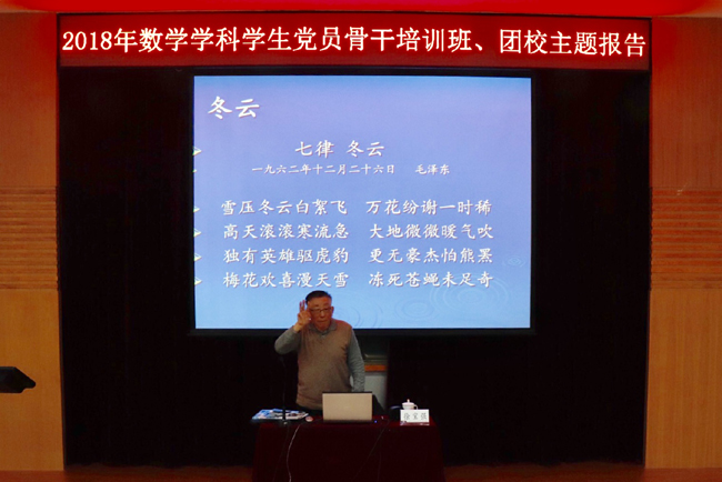 南开新闻网讯(通讯员 贾盛 李佳明)11月4日,数学学院员工党员骨干培训班、团校邀请市教育系统关工委夕阳红报告团宣讲报告员、天津理工大学徐宝强教授,以“自强不息,脚踏实地;爱我中华,创新创业——实现中国梦”为主题做辅导报告。数学学院团委负责人,数学学科员工党员骨干、新生党员、团校学员参加。
