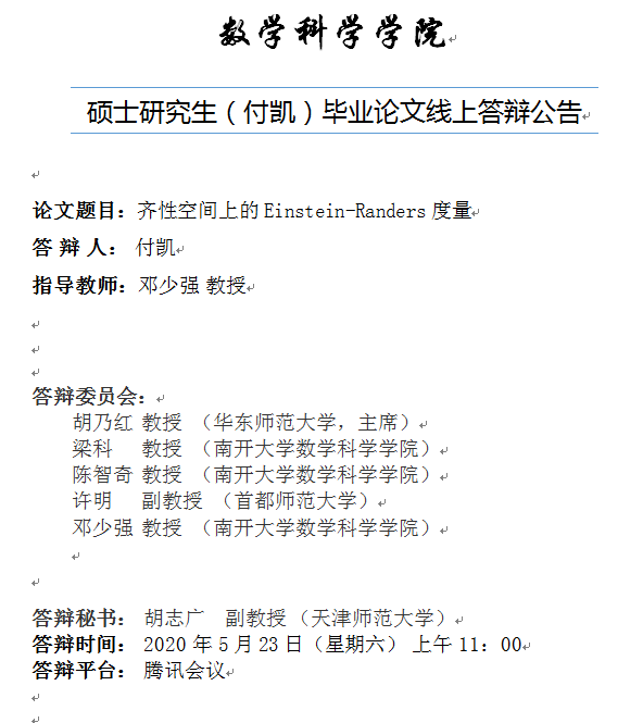 中国·必威(西汉姆联)官方网站-betwayspo 硕士研究生(付凯)毕业论文线上答辩公告