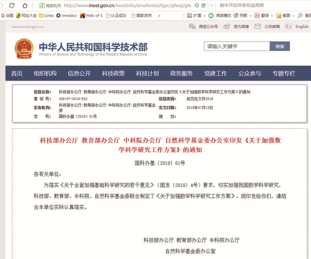 为贯彻落实国务院《关于全面加强基础科学研究的若干意见》(国发〔2018〕4号)要求,科技部、教育部、中科院、自然科学基金委于2019年联合制定了《关于加强数学科学研究工作方案》,强调了数学研究的重要性,在各个方面给予数学研究大力支持。