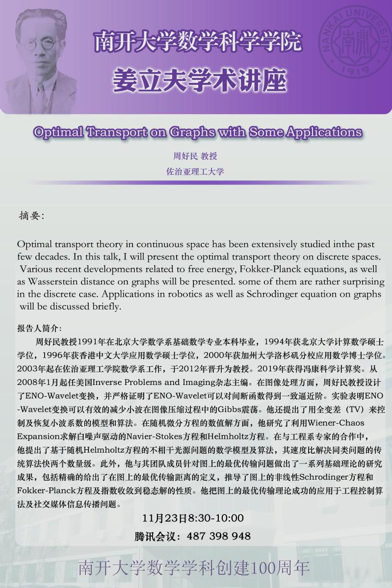 【姜立夫学术讲座】Optimal Transport on Graphs with Some Applications