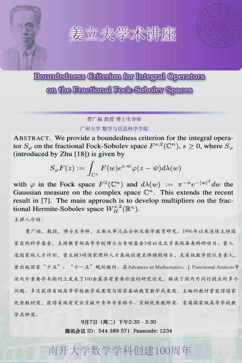 【姜立夫学术讲座】Boundedness Criterion for Integral Operators on the Fractional Fock-Sobolev Spaces