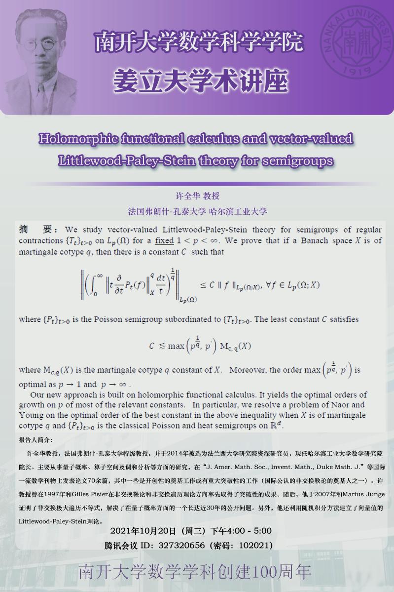 【姜立夫学术讲座】Holomorphic functional calculus and vector-valued Littlewood-Paley-Stein theory for semigroups
