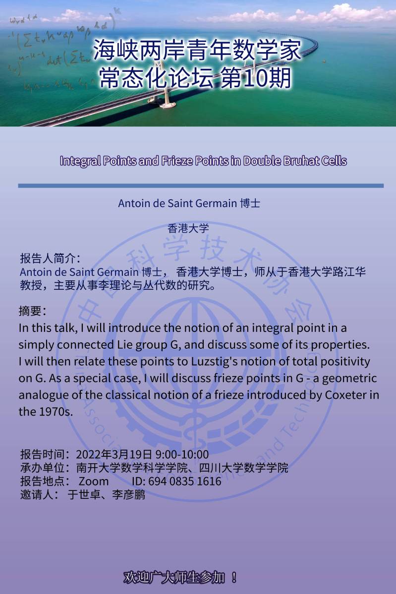 【海峡两岸青年数学家常态化论坛】Integral points and frieze points in double bruhat cells