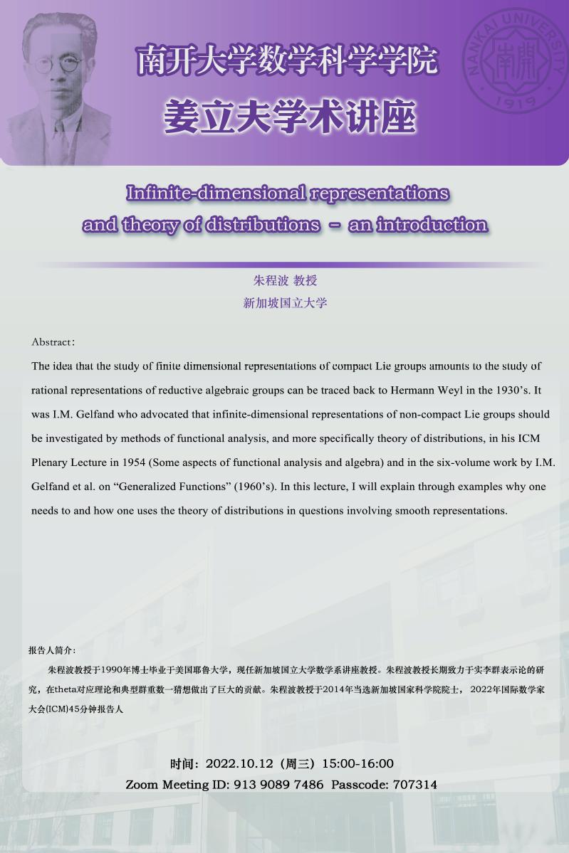 【姜立夫学术讲座】 Infinite-dimensional representations and theory of distributions – an introduction
