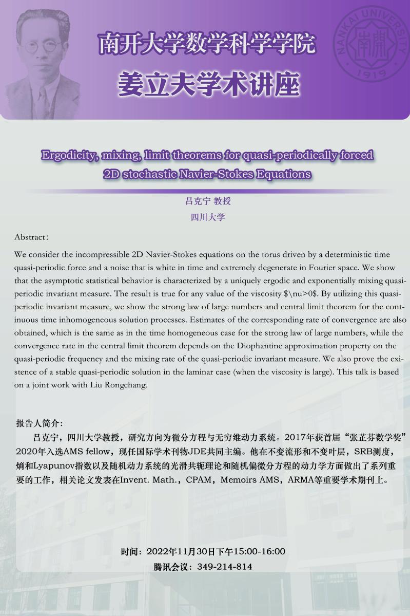 【姜立夫学术讲座】Ergodicity, mixing, limit theorems for quasi-periodically forced 2D stochastic Navier-Stokes Equations