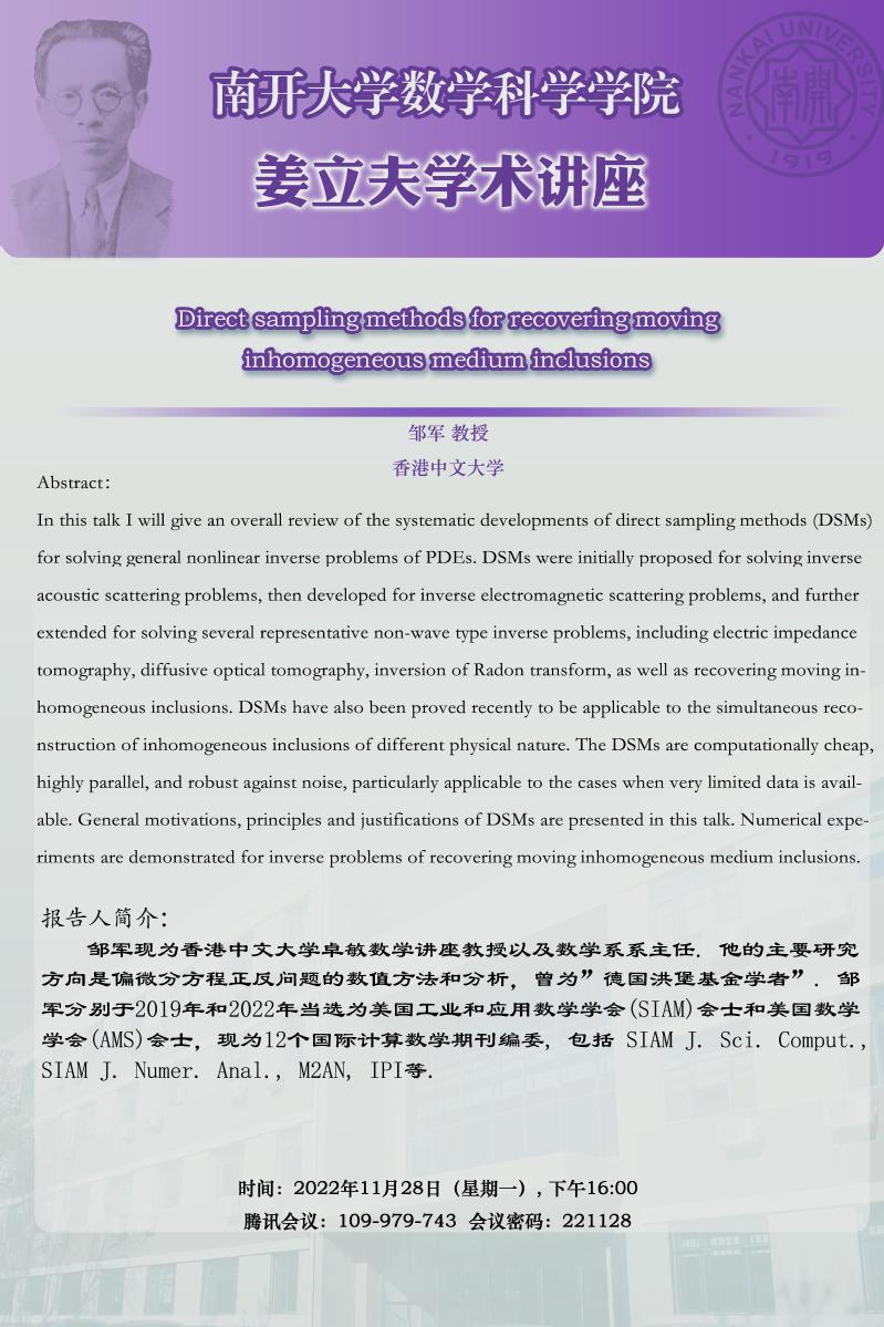 【姜立夫学术讲座】Direct sampling methods for recovering moving inhomogeneous medium inclusions
