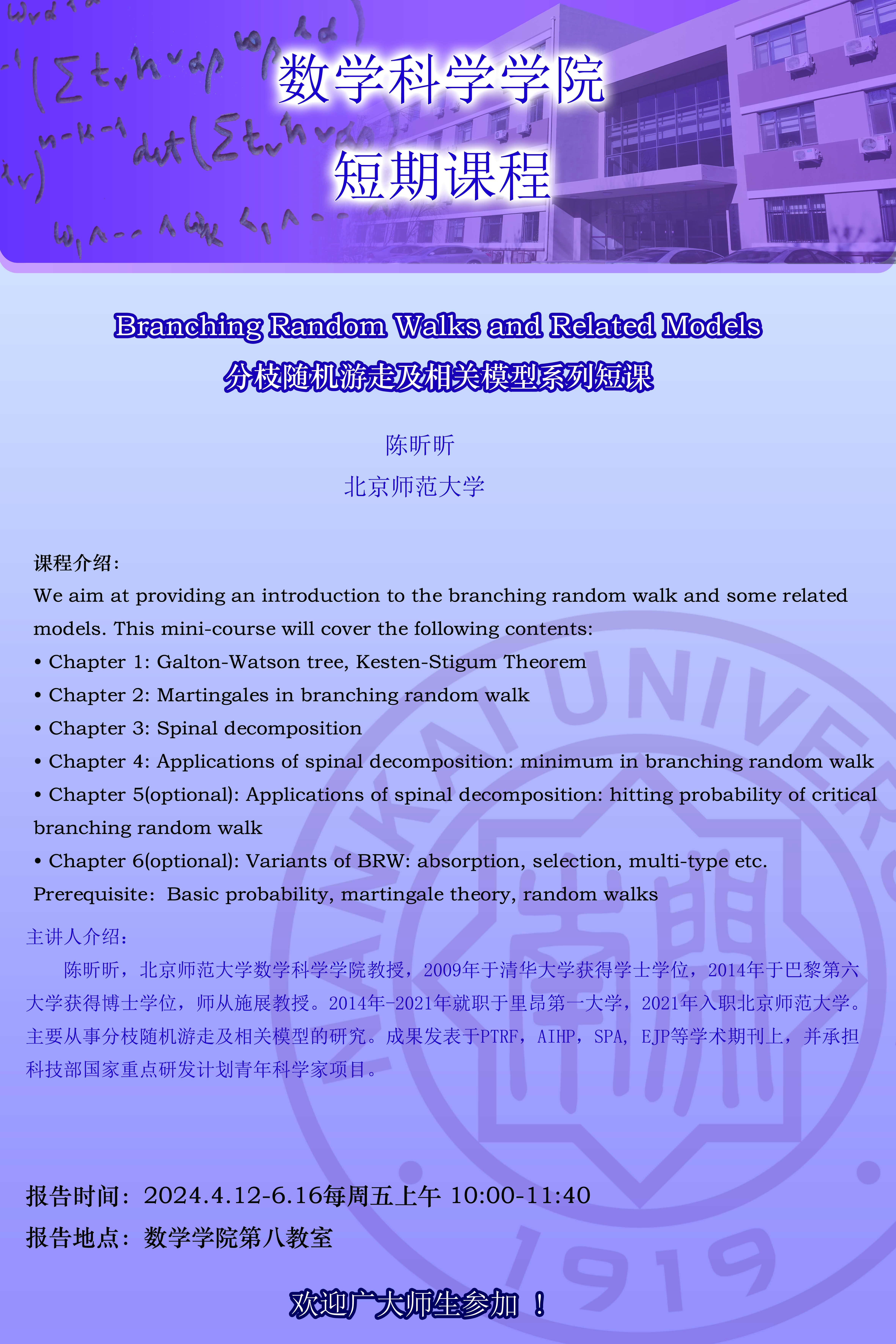 【短期课程】Branching Random Walks and Related Models 分枝随机游走及相关模型