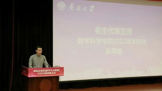 理科试验班(数学与大数据)模拟二班刘旺一作为新生代表发言。他回顾了十二载求学路及高考经历,期待从南开携手再出发,迎接新挑战。同时,他以南开“大先生”为榜样,呼吁新时代南开人应心怀家国,坐冷板凳练真本领,向最需处进发。