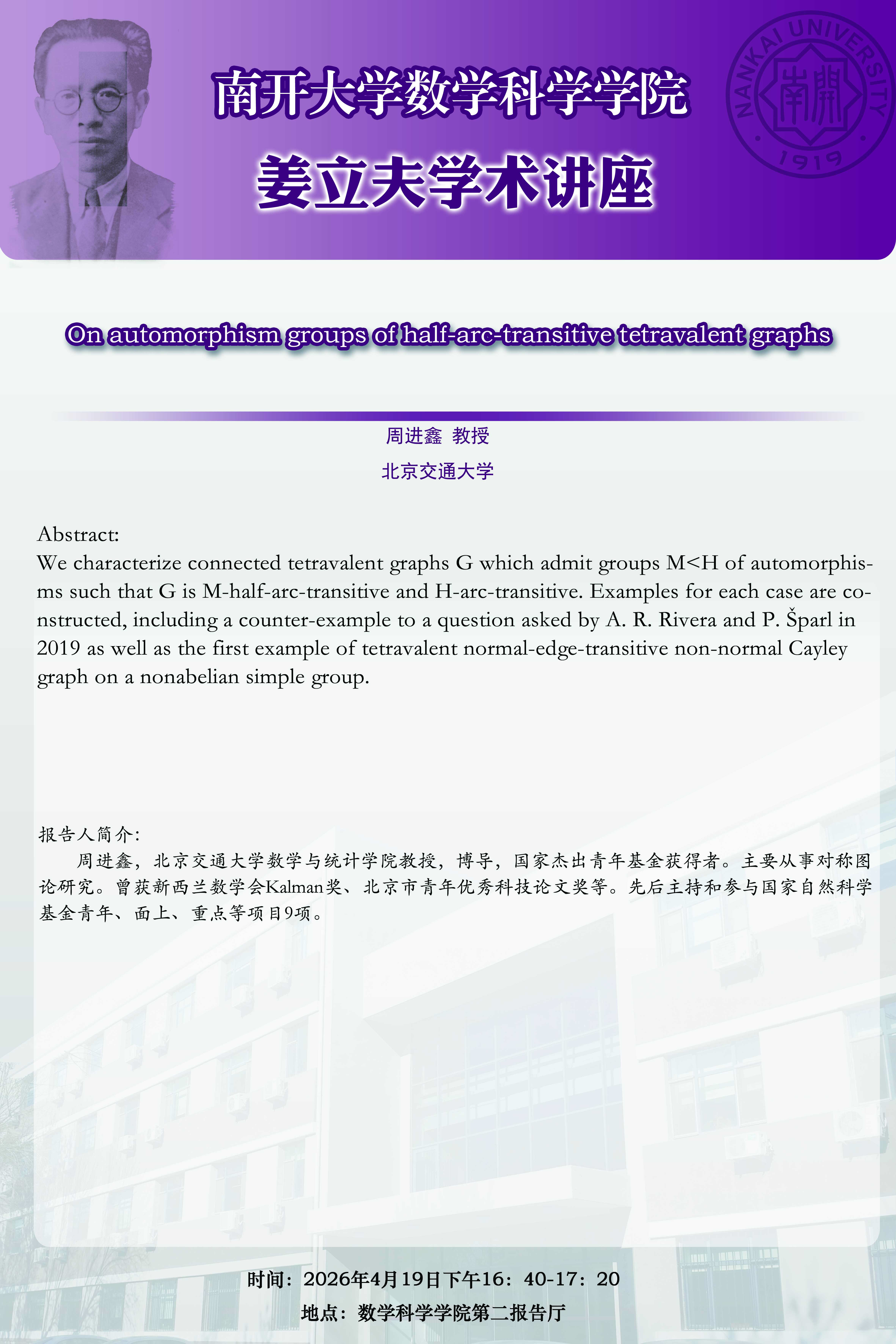 【姜立夫学术讲座】On automorphism groups of half-arc-transitive tetravalent graphs